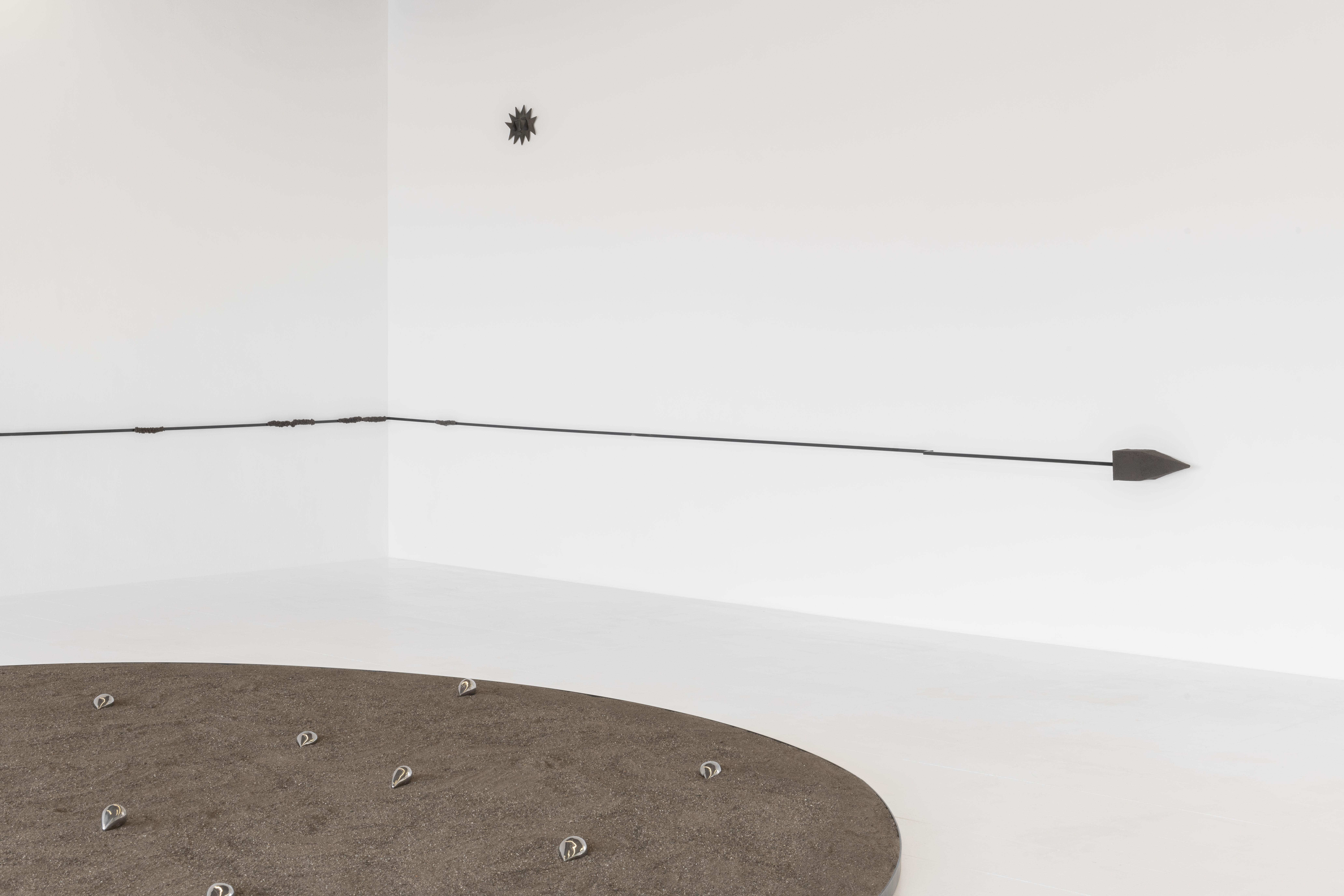 Mudar el rumbo genera un encantamiento en el que se cruzan saberes ancestrales con un pensamiento político y situado. Constituye una ofrenda para intentar restaurar la memoria herida del mundo y salir de la centralidad humana que silencia otras presencias. La serpiente de agua es un principio femenino, que reclama su lugar. Es un pulso de río. Un animal de poder, de transformación y renacimiento. Así lo vemos en su cabeza, con facciones grabadas casi como una escritura no occidental, como las líneas de una trenza. Amable pero oscura. Robusta. Las lágrimas del sol se convierten en bellas gotas de plata enterradas, un mineral inseparable de una historia de explotación y sometimiento. La instalación construye un relato abierto con varios personajes que son formas de vida, cuerpos líquidos que reclaman un equilibrio. Un conjunto de elementos sutiles, que fluctúan entre la abstracción y la ternura. Una ternura que navega como puede por la violencia colonial, la precariedad y la resistencia.